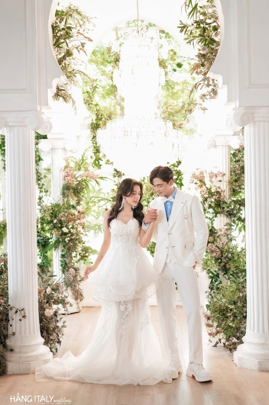 Bộ ảnh được thực hiện tại một khu vực trong Santorini Park với không gian ngập tràn ánh sáng tự nhiên, những cột trụ trắng tinh khôi, và các chi tiết xanh tươi từ cây cối, hoa lá. Khung cảnh này mang đậm hơi thở Địa Trung Hải, với những ô cửa sổ lớn, ánh sáng chan hòa, và không gian mở thoáng đãng. Nhưng Hằng Italy Studio đã khéo léo lồng ghép thêm vibe Hàn Quốc qua cách phối màu và phong cách chụp. Tông màu chủ đạo là trắng và xanh pastel. Tạo cảm giác nhẹ nhàng, trong trẻo, nhưng vẫn có điểm nhấn từ ánh sáng vàng ấm áp. Làm bức ảnh vừa sang chảnh vừa ấm áp.