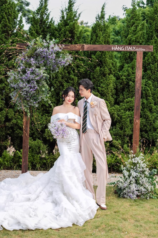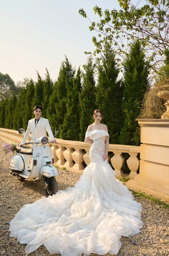 Trong một concept khác, cặp đôi lại chọn phong cách thoải mái hơn, với cô dâu diện váy cưới trắng đơn giản nhưng vẫn toát lên vẻ thanh thoát, còn chú rể mặc vest đen tối giản. Tạo sự tương phản thú vị với khung cảnh xanh mướt xung quanh. Phong cách này không chỉ làm nổi bật cá tính của cặp đôi. Mà còn mang đến một làn gió mới cho ảnh cưới ngoại cảnh, vừa tự nhiên, vừa “chất”. Rất hợp với các cặp đôi Gen Z yêu thích sự phá cách.