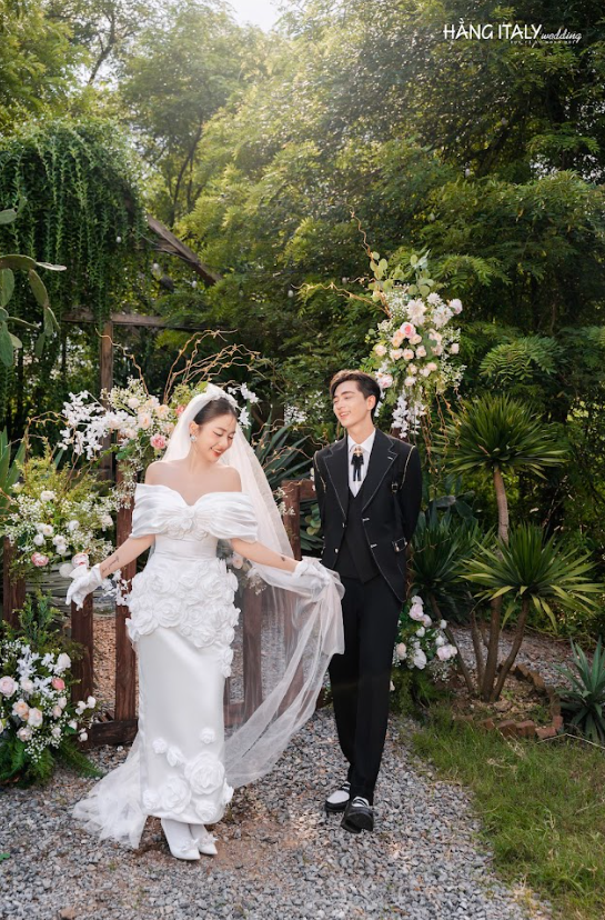 Trong một bức ảnh, cặp đôi đứng giữa không gian ngập tràn cây xanh và ánh sáng, với những cột trụ trắng làm nền. Tạo nên một khung cảnh vừa cổ điển vừa hiện đại. Một bức ảnh khác lại được chụp ngoài trời . Trên bãi cỏ xanh mướt với vòm hoa trắng làm điểm nhấn. Mang đến cảm giác như một buổi picnic tình yêu giữa thiên nhiên.